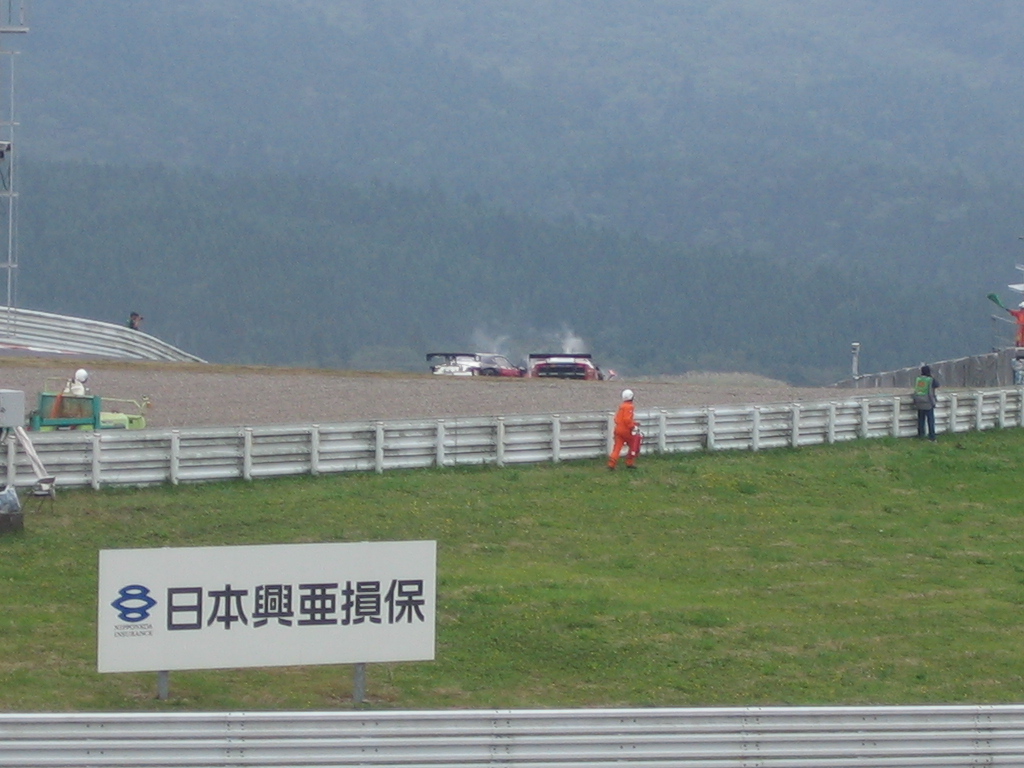 先ほど書いたGT300を走る『JLOC』の車両がジェットコースター手前のコーナーでスピンし、GT500のトップを走るZENT CERUMO SCが何とその車両と衝突してしまうという事件が!!