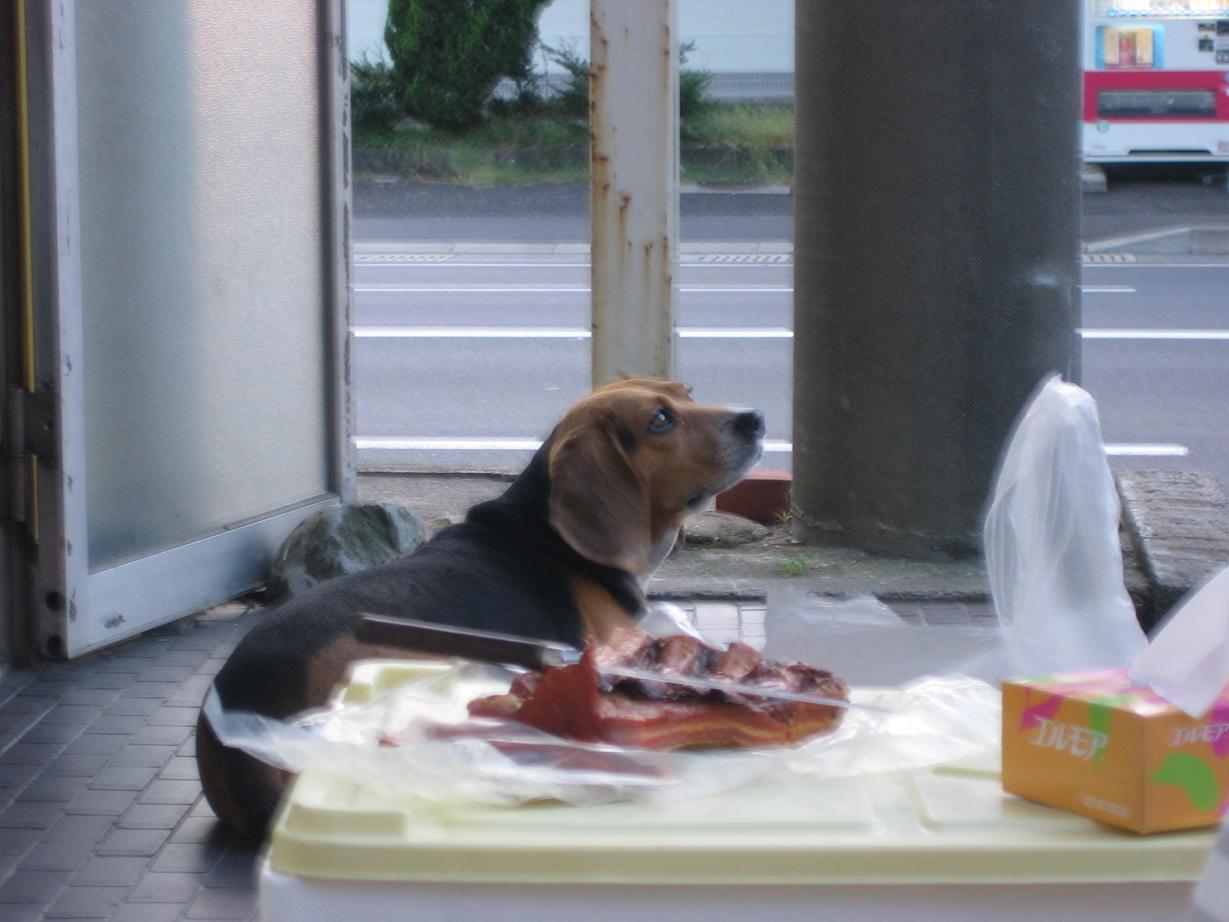 途中、それに耐えかねた(?)看板犬のナナも、焼く前の生肉をペロリ。