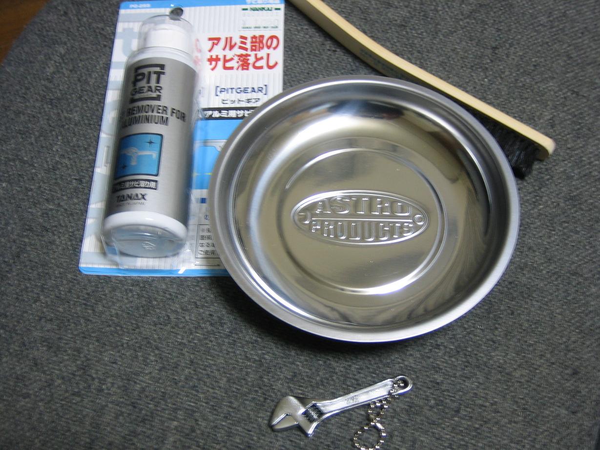 左上はアルミのサビを落としてくれる溶剤。それに右上のブラシ。